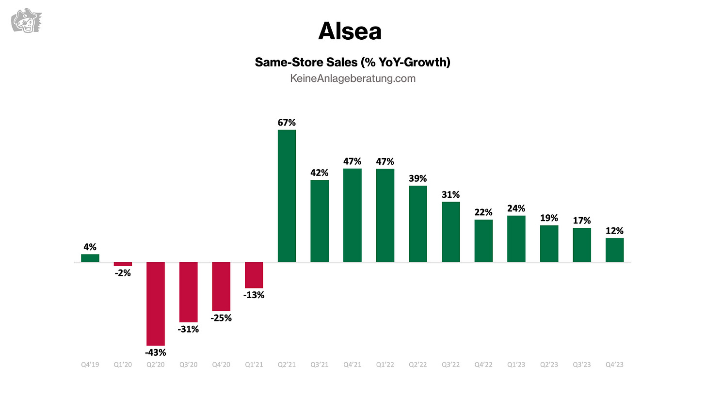 Ein wichtiger Indikator für diese Entwicklung sind die Same-Store Sales, die ich sorgfältig für euch zusammengestellt habe. Es ist zu beachten, dass diese Daten quartalsweise dargestellt sind und den Zeitraum von 2020-2023 abdecken. Dieser Zeitraum ist kürzer als es auf den ersten Blick im Diagramm erscheinen mag.