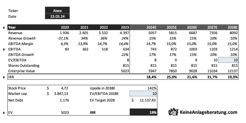 Basierend auf folgenden Annahmen, die etwas optimistischer sind, als ich es sonst mache, allerdings auch schnell übertroffen werden können, wenn es im Unternehmen gut läuft, komme ich auf eine jährliche Rendite von 19%.