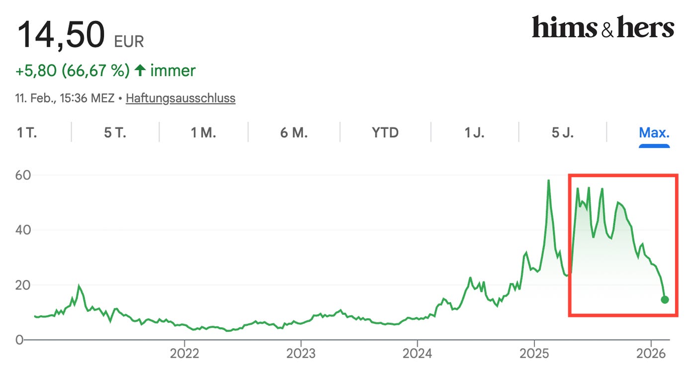 Was das für das Geschäft von Hims&Hers bedeutet, welche Auswirkungen das auf die Bewertung hat und welche Folgen das nach sich ziehen kann, wollen wir heute schon vor den Quartalszahlen untersuchen, die am 23. Februar folgen werden. ⤵️