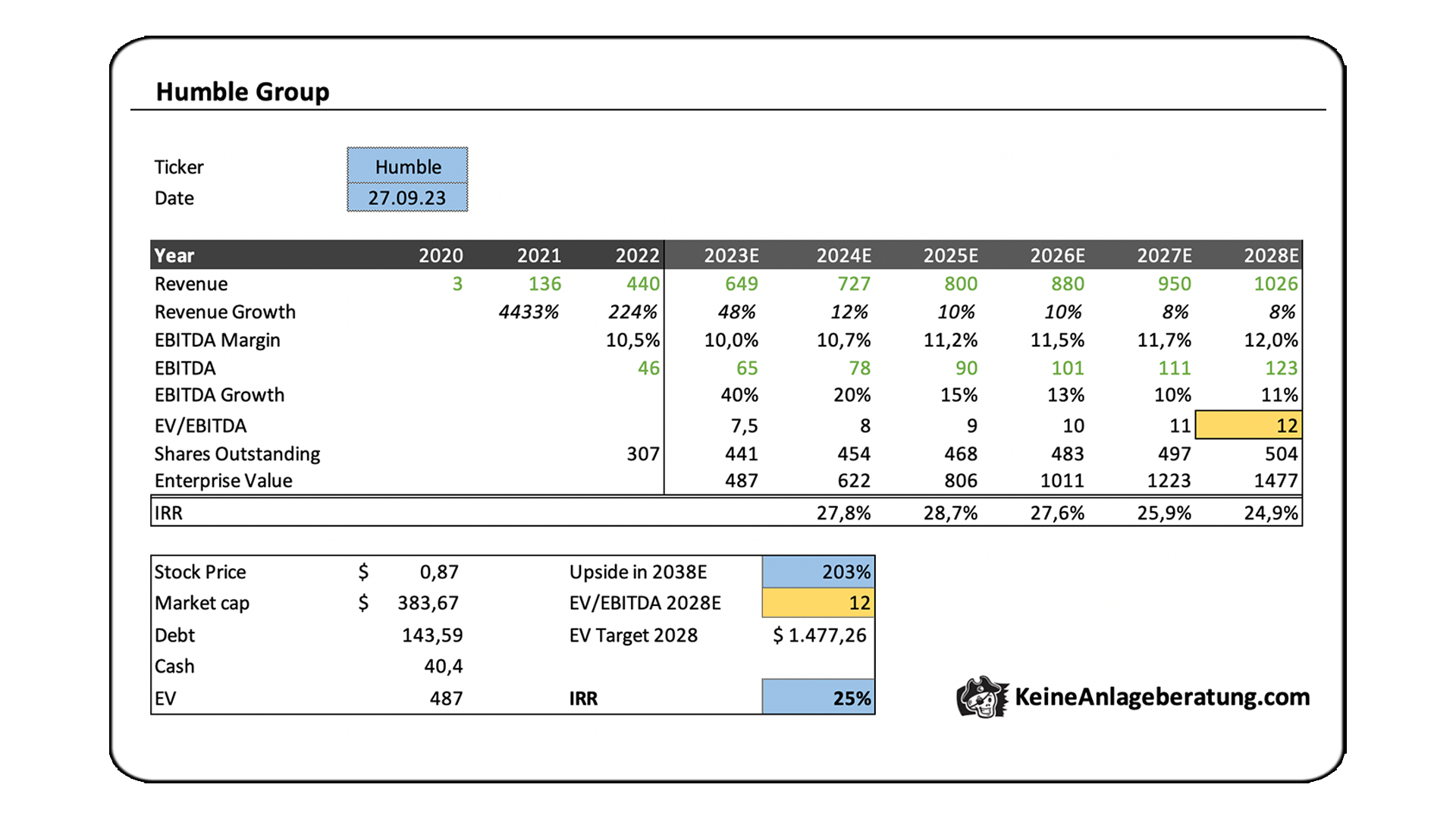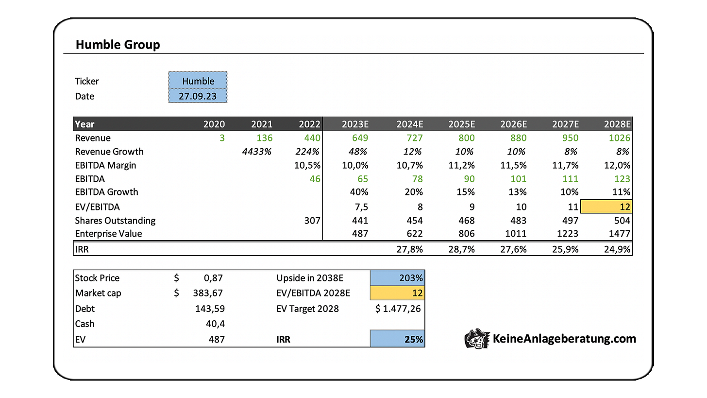 Trotzdem wird ersichtlich, dass die Humble Group mit dem organischen Wachstum, welches das Unternehmen mitbringt und potenzieller Margen-Expansion in den kommenden Jahren, ziemlich günstig bewertet ist. Ich bin kein Fan davon ein Unternehmen ausschließlich anhand der Vergleichswerte zu bewerten, allerdings helfen solche Zusammenstellungen, um sich ein besseres Bauchgefühl zu verschaffen, ob die getätigten Annahmen im Bewertungsmodell realistisch sind.