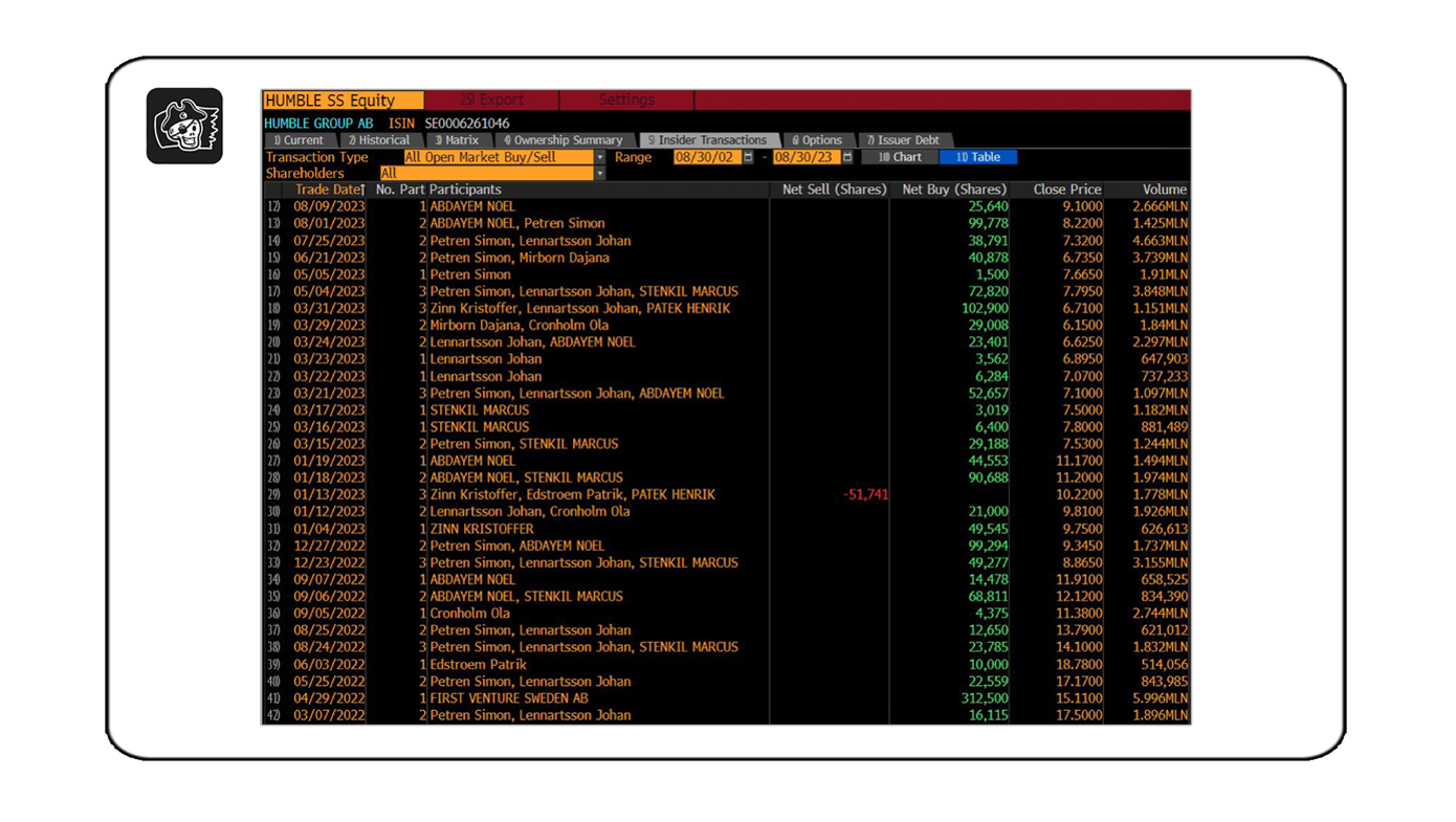 Auch schön anzusehen ist die Grafik der vergangenen Insider-Käufe/Verkäufe. Hier erscheinen zwar keine riesigen Trades, aber es wird ersichtlich, dass kein Anteilseigner es aktuell für eine gute Idee hält, Aktien der Humble Group zu verkaufen.
