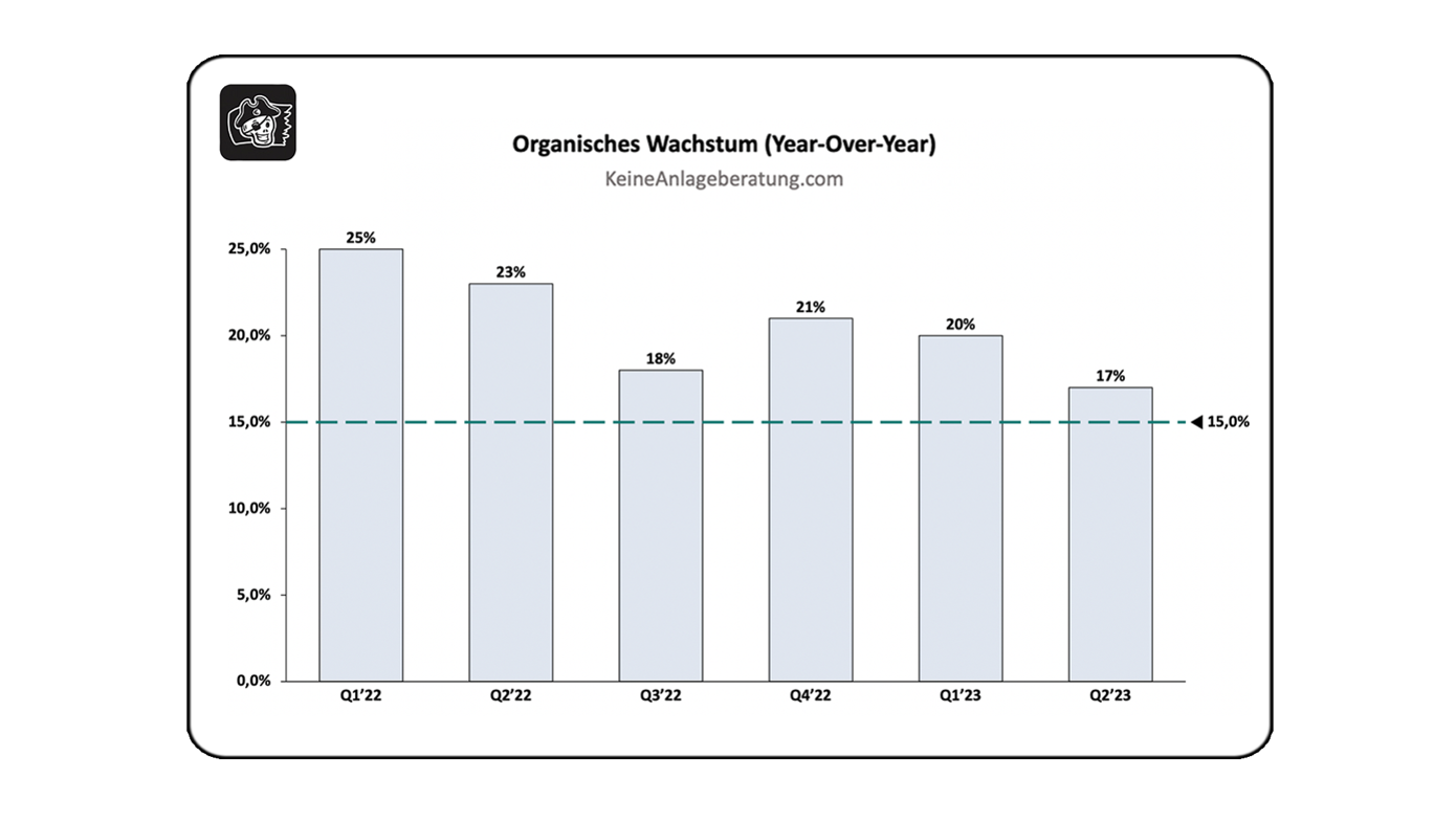 Ein Blick auf das vom Management ausgewiesene organische Wachstum verspricht uns Klarheit zu geben, wie die eigene Entwicklung tatsächlich aussieht. Es zeigt das quartalsweise Wachstum, exklusive Übernahmen, die im jeweiligen Quartal getätigt wurden. Das eigene Ziel von 15% organischem Wachstum erreichen sie bislang locker.
