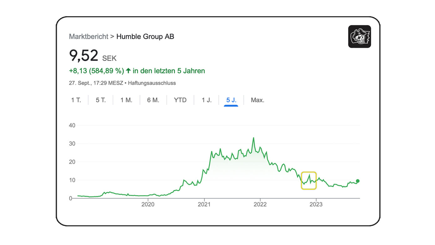 Im Q4, 22 fanden Übernahmegespräche zwischen dem Management und einer unbekannten Partei statt, welche das Ziel hatten das Unternehmen von der Börse zu nehmen. Der Aktienkurs in der Zeit war in der Region zwischen 7,5-12 SEK, somit war von einem Übernahmeangebot von >15 SEK auszugehen.