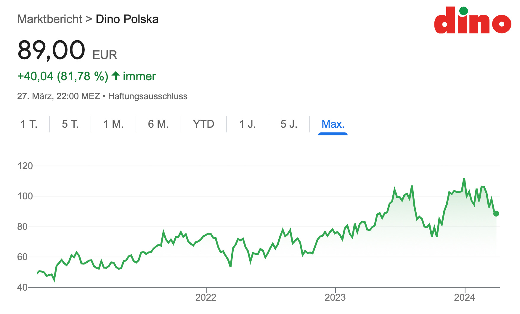 Dino Polska ist die größte Supermarkt-Kette aus Polen. Das Unternehmen betreibt unter der Marke Dino fast 1.500 Lebensmittelmärkte. Mittlerweile ist das an der Warschauer Börse gelistete Unternehmen fast 10 Mrd. Euro Wert!