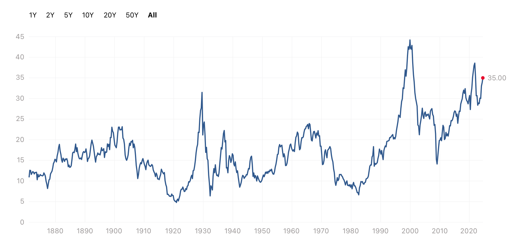 Steigende Indizes alleine sagen noch überhaupt nichts über den aktuellen Stand des Marktes aus. Das Shiller PE-Ratio gibt uns da schon einen besseren Überblick. Es liegt wieder bei 35x, was mir zumindest für den breiten Markt Sorgen bereitet, ohne hier Crash-Angst verbreiten zu wollen.