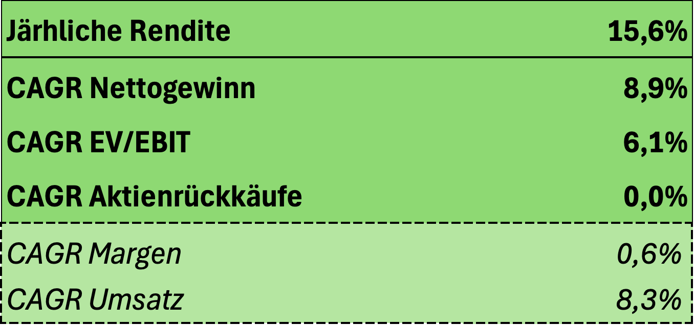 Die Formel zeigt also sofort: Der Großteil deiner Rendite (8,3%) kommt aus Umsatzwachstum, ein solider Teil (6,1%) aus der erwarteten Neubewertung und der Rest aus einer leichten Margenverbesserung (0,6%).