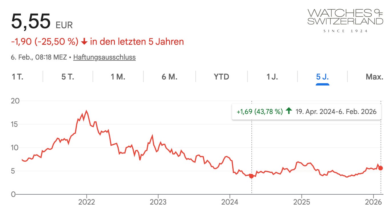 Lass uns das Ganze an einem vereinfachten Beispiel durchspielen. Im April 2024 haben wir den Luxusuhren-Verkäufer Watches of Switzerland im Blog analysiert. Aus der Analyse ergaben sich gerundet folgende Annahmen für die folgenden 5 Jahre: