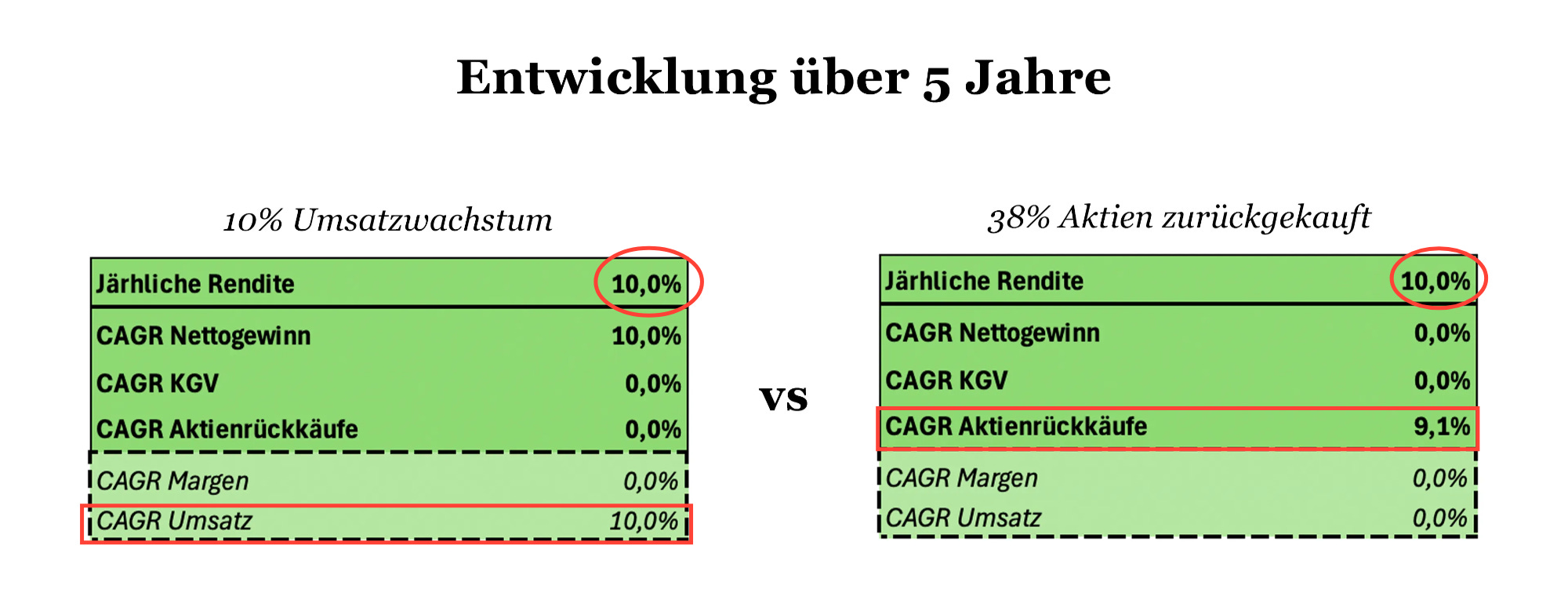 Ob ein Unternehmen 10% Umsatzwachstum pro Jahr erzielt oder 5 Jahre lang jährlich 9,1% der Aktien zurückkauft (38% über 5 Jahre), beides führt zu einer jährlichen Rendite von 10%, wenn man alle anderen Faktoren konstant hält.
