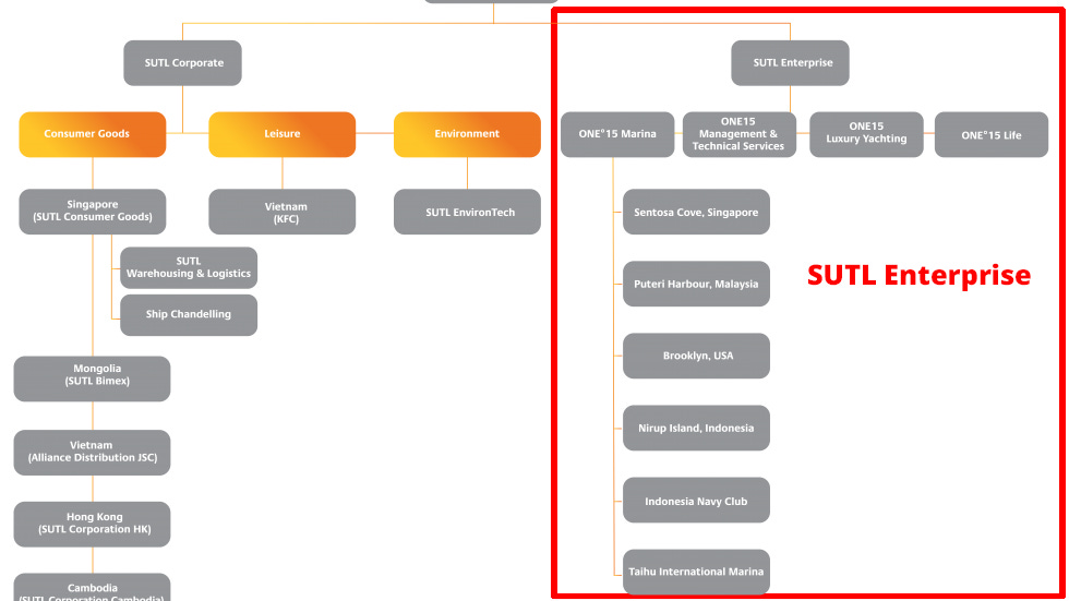 SUTL Enterprise ist der führende Hafenbetreiber für Luxus-Yachten in Asien. Ihr wichtigster Hafen, One°15 Sentosa Cove, befindet sich in der Nähe ihres Hauptsitzes in Singapur und operiert mit fast 100 % Auslastung, einer Warteliste von 2.5 Jahren und kassiert jährliche Mitgliedschaftsbeiträge in Millionenhöhe.