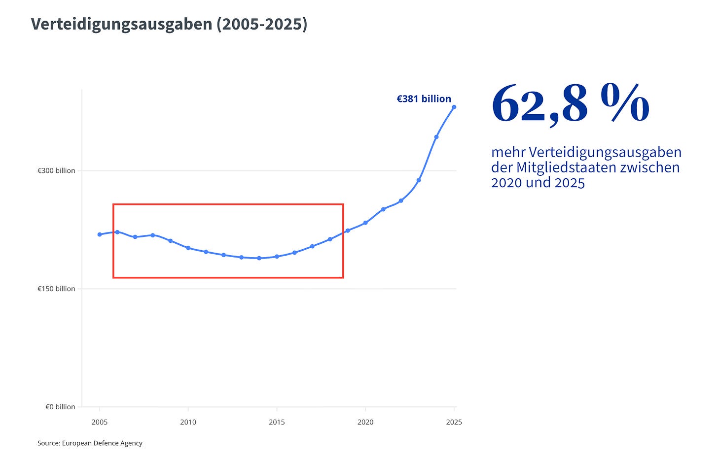 Die Zahlen der europÀischen Verteidigungsagentur sind eindeutig. Jahrelang haben wir uns in falscher Sicherheit gewÀhnt und immer weniger investiert, bis die RealitÀt uns eingeholt hat. Konflikte in unmittelbarer NÀhe und schwindendes Vertrauen in die USA haben sogar Deutschland zum Handeln gebracht!