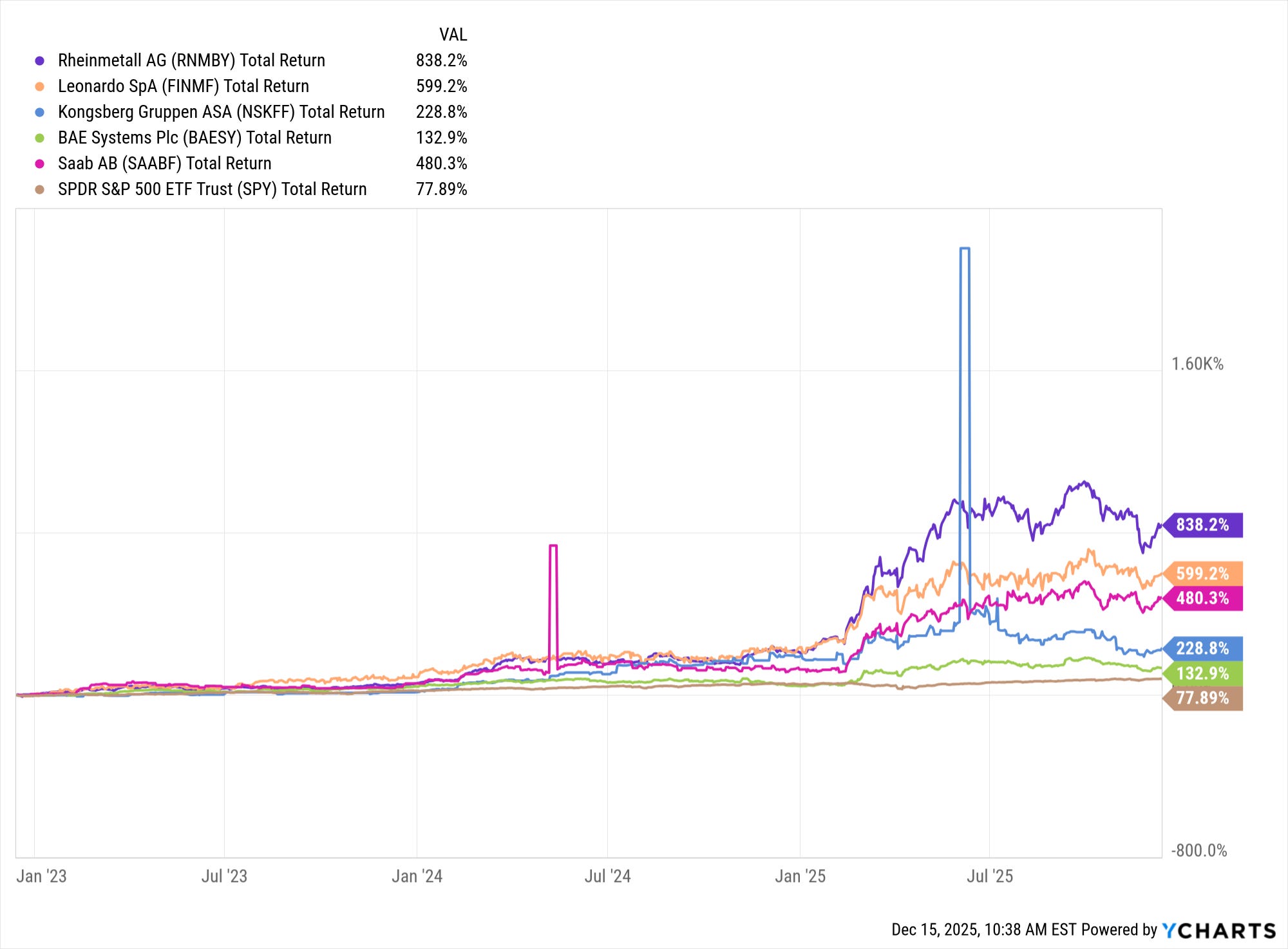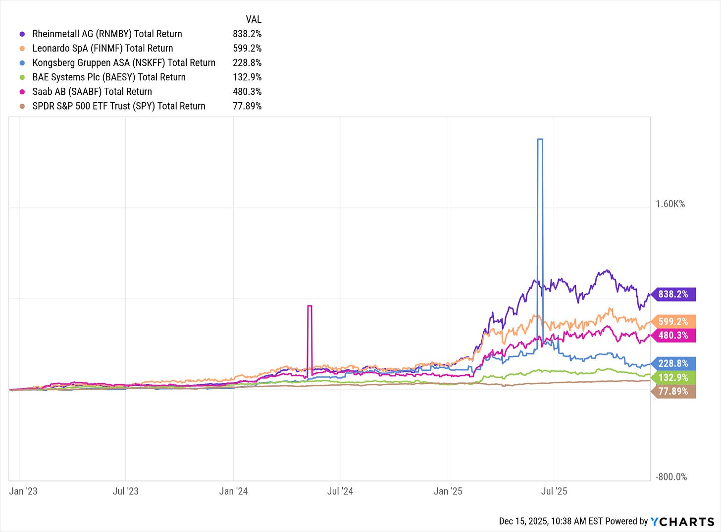 Das sind beispielsweise Rheinmetall in Deutschland, BAE in der UK, Leonardo in Italien, Kongsberg Gruppen in Norwegen oder SAAB AB aus Schweden. Diese Unternehmen bĂŒndeln viele groĂe VertrĂ€ge. Das zeigt sich dann auch in den Aktienkursen dieser Unternehmen ĂŒber die letzten drei Jahre.